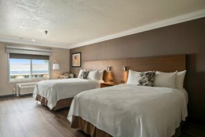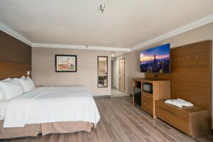 Our Accessible rooms are available with one King or 2 queen configurations. This room offers accessible features for mobility and communication assistance. Our spacious bathroom offers ease entry and use.
